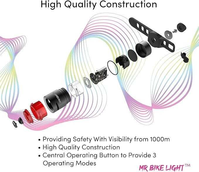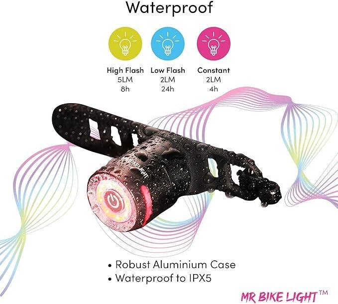 With 3 different modes offering flashing, permanently on and varying brightness this rear bike light is the ideal partner for Mr Bike Light front lights.
